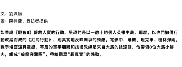 不仅如此,徐添发在接受采访时说《蛟龙行动》追求的是真实感,还说《战狼2》纯粹是个人英雄……我真是从未见过如此厚颜无耻之人!要不是吴京打开民族自豪主旋律这个门,你拍的就是个屁!